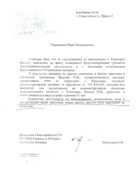 Об этом правозащитнику Марку Бен-Наим сообщил сам начальник Евпаторийского горотдела милиции Камал Абдуллаев. Еще в начале курортного сезона в городе Евпатория журналистами сайта "Крымский аналитик" были сделаны фотографии некоего дельца, который на жаре устроил выставку декоративных птиц и собирал деньги за фотографирование с пернатыми. Птицам приходилось проводить целый день на солнцепеке ради пополнения мошны своего владельца. Все попытки граждан потребовать у дельца документы подтверждающие законность его "бизнеса" оказались безуспешны в связи с чем были направлены жалобы в Евпаторийский горотдел милиции. Только через два месяца правозащитник Марк Бен-Наим получил ответ начальника Евпаторийской милиции Камала Абдуллаева из которого следует, что незаконная деятельность живодера прекращена, а других подобных фактов в Евпатории не выявлено. Отправившийся на место журналист "Крымского аналитика" Марк Агатов в очередной раз запечатлел всю ту же картину - тот же живодер, и те же несчастные птицы в буквальном смысле в поте лица добывающие прибыль своему хозяину.