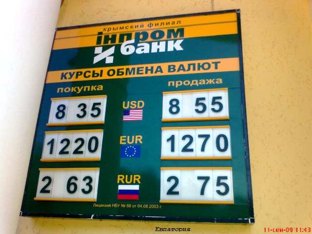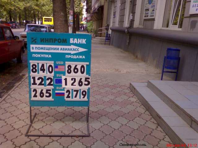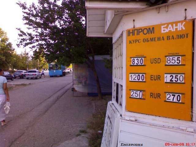 Курс обмена валют Крымский папарацци 9-11 сентября 2009 года провел фото мониторинг курса обмена  валют в Симферополе и Евпатории. За 100 долларов США в Крыму платили по 810-845 гривен. А продавали те же 100 долларов США клиентам банков в Евпатории и Симферополе по 855-870 гривен. Тысячу рублей России в Крыму меняли на 245-265 гривен. Продавали 1000 рублей России клиентам банков по 270-280 гривен. 100 ЕВРО покупали у туристов по 1200-1220 гривен, а продавали эти же 100 ЕВРО  в пунктах обмена валют Евпатории и Симферополя по 1250-1270 гривен. А теперь, для сравнения: курс обмена наличной валюты в Крыму. 8 сентября 2009 года.  100 долларов США продавали населению в пунктах обмена валют и филиалах коммерческих банков по 885 - 895 гривен. А покупали эту же сотню долларов США у туристов из России и республики Беларусь в Евпатории по 865 - 870 гривен. Подробнее о курсе валют в Крыму смотрите на фото мониторинге "Крымского аналитика".