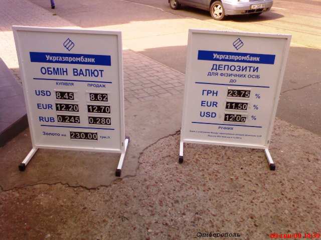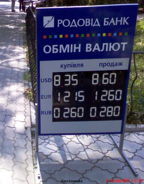 Фото мониторинг курса обмена валют в Крыму. Симферополь - Евпатория. Курс обмена доллара США в обменных пунктах и филиалах коммерческих банков Украины  в Крыму пошел вниз.