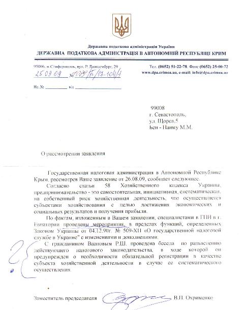 25.09.09 года заместитель председателя ГНА в АРК В.П.Охрименко направил  мне письмо ( приложение 1).