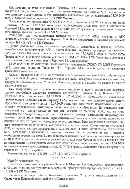 ПОЛУЧЕН ТЕКСТ ПОСТАНОВЛЕНИЯ КИЕВСКОГО РАЙОННОГО СУДА ГОРОДА СИМФЕРОПОЛЬ О НЕЗАКОННОСТИ ЗАДЕРЖАНИЯ МАРИНЫ ЧЕРНОВОЙ. ВОО Центр Защиты Прав Человека «СВОБОДА» получил копию Постановления судьи Киевского районного суда города Симферополь Михаила Белоусова, которым подтвержден факт незаконности задержания заместителя мэра Симферополя Марины Черновой и заявляет о намерении привлечь к уголовной ответственности как следователя Крымского главка милиции Н.А.Тищенко, так и свидетелей, на основании показаний которых Марина Чернова была незаконно лишена свободы.