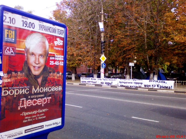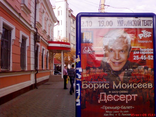 Главное Управление МВДУкраина. Крым. Симферополь. Вначале недели  редакция «Крымского аналитика» решила отправить в Симферополь крымского папарацци на экскурсию. Ему было предложено сделать красивый фоторепортаж из Симферополя без политики и политиков. Редактору хотелось увидеть на фото «что-то светлое и приятное». Крымский папарацци съездил в столицу Крыма, прогулялся по центру Симферополя и привез оттуда все того же… Москаля, но уже не с Киселевым, а с Борей Мойсеевым. Редактор кипел от возмущения: «Опять Москаль, да кому он нужен в Крыму. Надоел до печенок. Тебя же просили, клоуна снять в цирке!». – Так я и снял про  клоуна, - стал оправдываться крымский папарацци. - Иду по улице Кирова, никого не трогаю и нос к носу с Борей Моисеевым. Стоит у дверей в Главное Управление МВД Украины в Крыму и ментов зазывает к себе на десерт. Я,  конечно, щелкнул на память. А тут мужик сзади пристроился и шепчет, мол, улицу перейди, там вся правда о Боре Моисееве и Генаше Москале». Я перешел, а там Москаля народ и в хвост, и в гривну, словами и плакатами. Я и это снял, потому что на плакатах – правда жизни, и вход в главк с иномарками снял. А мужик, тот, что Борю Мойсеева от страждущих, охранял у входа в милицию, шепчет в самое ухо: «Бориса Моисеева повесили по личному указанию Москаля, чтоб  симферопольских мужиков от пикетчиков отвлекал своими призывами, но сведущие люди говорят, что у Москаля к Боре Моисееву еще и личный интерес присутствует».