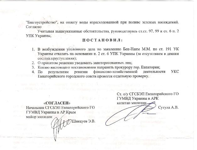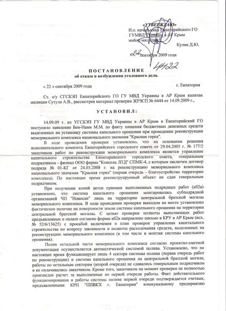 Погибли деревья на Красной горкеНовости Украины. Крым. Евпатория. Погибшие на «Красной горке» в Евпатории деревья милицию Крыма не интересуют. Об этом сообщил правозащитнику Марку Бен-Наим  старший оперуполномоченный ОГСБЭП Евпаторийского ГО милиции А.В.Сутула, который вынес Постановление об отказе в возбуждении  уголовного дела по факту отсутствия капельного орошения на Красной Горке в Евпатории. Напоминаем, что ранее интернет-сайт «Крымский  Аналитик» опубликовал фотографии погибших деревьев под которыми не было видно и следов установки систем капельного орошения, о  которых заявляли должностные лица Евпаторийского горсовета. По данному факту были направлены жалобы, проверку которых поручили  сотрудникам ГСБЭП Крыма. Из вынесенного господином Сутулой Постановления об отказе возбуждении уголовного дела (документ  прилагается) выяснилось, что ситуация в Евпатории сложилась еще более серьезная, чем считалось ранее. Деревья на Красной Горке были  высажены ВООБЩЕ БЕЗ УСТАНОВКИ СИСТЕМ ОРОШЕНИЯ. При этом деревья закупались за счет бюджетных денег, их посадка оплачена, но  всем заранее было известно, что эти закупленные за госсчет деревья ПОГИБНУТ без воды.