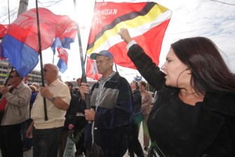 И  вот сегодня, в 13  часов, когда сотрудники милиции внимательно изучали периметр площади, из подземного перехода раздалось легендарное  дедовское «Ура!», и под громкое скандирование «Фашизм не пройдет!» с флагами и транспарантами на площадь «Советская» вышли активисты  Молодежной организации «Прорыв».
