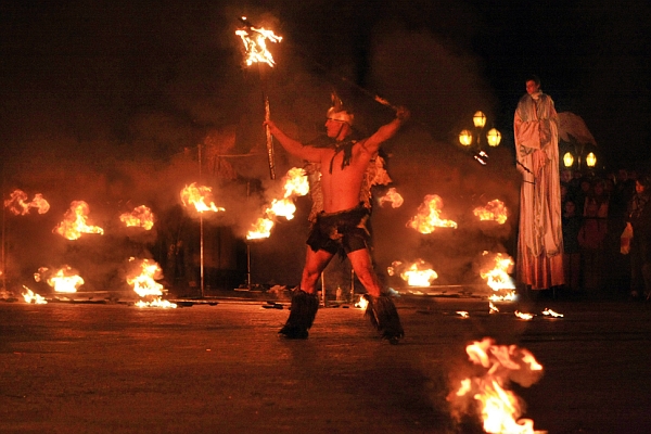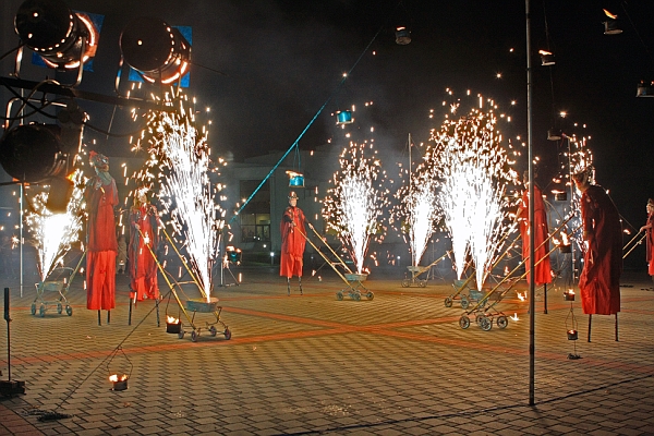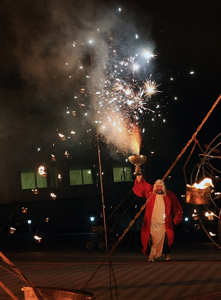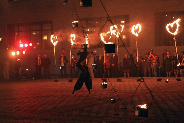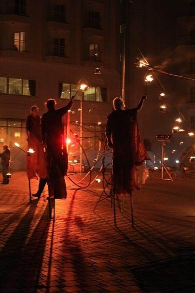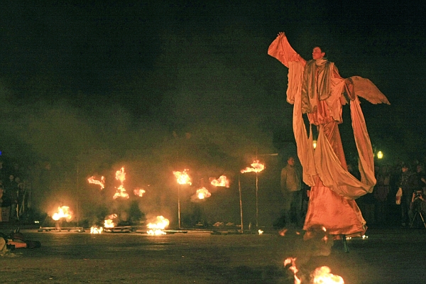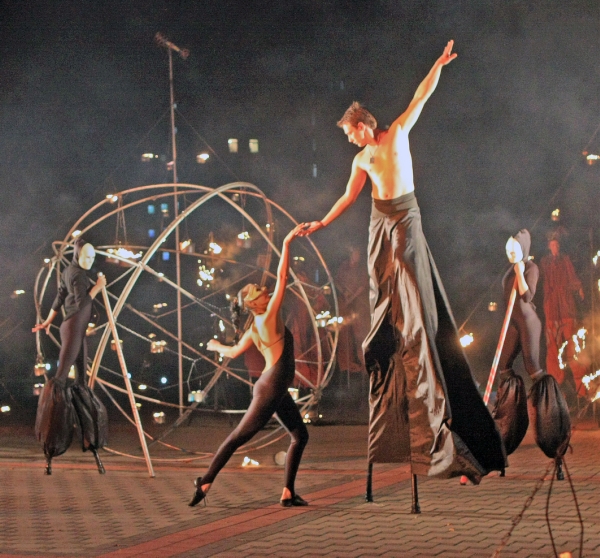 Когда стемнело, артисты на ходулях  устроили красочное  огненное шоу для участников форума. Душу распирала гордость от осознания того факта, что развлекать высоких гостей могли пригласить любой коллектив с фестиваля, но  лучше наших высоких артистов никого не нашлось!