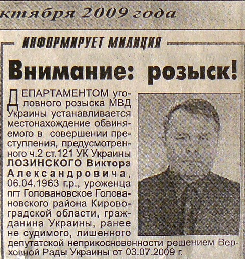 Объявление о розыске ЛозинскогоВ городской газете «Евпаторийская здравница»  в конце октября 2009 года под рубрикой «ВНИМАНИЕ, РОЗЫСК!» было опубликовано следующее объявление: «Информирует милиция. Внимание, розыск! Департаментом уголовного розыска МВД Украины устанавливается местонахождение обвиняемого в совершении преступления, предусмотренного ч. 2 ст.121 УК Украины   Лозинского Виктора Александровича, 06.04.1963 г.р., уроженца пгт Головановское Головановского района Кировоградской области, гражданина Украины, ранее не судимого, лишенного депутатской неприкосновенности решением Верховной Рады Украины от 03.07. 2009 года».  По оперативной информации, полученной крымскими правозащитниками, Виктор Лозинский скрывается на одной из крымских дач высокопоставленных чиновников - БЮТовцев. Однако, как нам стало известно из источников близких к МВД Украины, ни один подобный объект в Крыму  сотрудниками милиции обследован не был. И это несмотря на то, что соратник премьер-министра Правительства Украины Юлии Тимошенко, член фракции Блока Юлии Тимошенко в парламенте Украины Виктор Лозинский обвиняется органами правопорядка в нанесение умышленных тяжких телесных повреждений, совершенных способом, носящий характер  особого мучения, совершенного группой лиц и  повлекшее смерть потерпевшего. За это преступление Народному депутату Украины, избранному в Верховную раду Украины по спискам Блока Юлии Тимошенко Виктору Лозинскому, грозит лишение свободы сроком от семи до десяти лет.