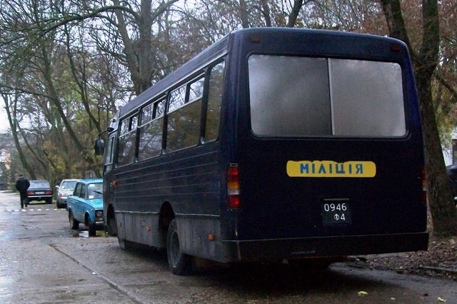 А в это время во дворе прятался автобус «БЕРКУТА» с военными номерами и надписью милиция.