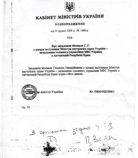 Новости Украины. Фото. Документ. Геннадия Москаля уволили с должности начальника крымской милиции Печать E-mail