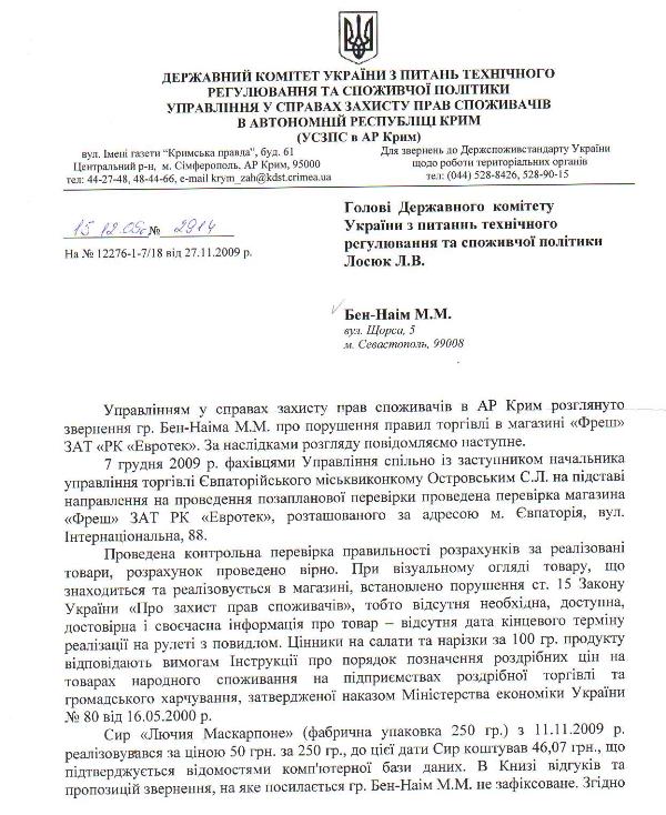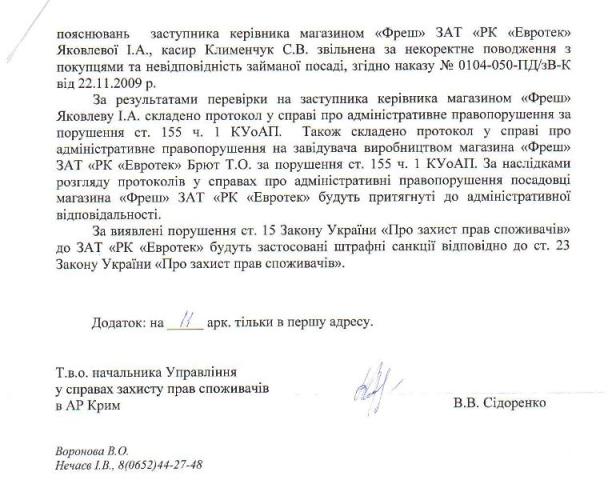 Документ Целый ряд сотрудников Евпаторийского супермаркета «ФРЕШ» привлечены к ответственности. За выявленные нарушения статьи 15 Закона Украины  «О защите прав потребителей» владелец магазина - ЗАО «РК «ЕВРОТЕК» будет оштрафован в соответствии с требованиями статьи 23 Закона Украины «О защите прав потребителей». Кассир магазина Клименчук С.В. уволена за некорректное поведение с покупателями и несоответствие занимаемой  должности. Об этом правозащитнику Марку Бен-Наим сообщили в Главном Управлении по делам защиты прав потребителей в АР Крым. Столь жесткие меры были приняты к сотрудникам магазина «ФРЕШ» в ответ на публикацию на сайте   «КРЫМСКИЙ АНАЛИТИК» статьи под названием «Как в Евпаторийском «ФРЕШЕ» обманывают  покупателей». Обсуждая эту статью на сайте «Крымский аналитик», читатели приводили и другие примеры нарушения прав потребителей в магазине «ФРЕШ». Редакция «Крымского аналитика» потребовала привлечь к ответственности  виновных лиц. По материалам статьи крымский правозащитник Марк Бен-Наим  направил обращения в адрес УГСБЭП Крымского главка милиции и председателя Госпотребстандарта Украины. Сегодня мы получили ответ о принятых мерах.  В этом документе в частности говорится о том, что сотрудники магазина обманывали покупателей, указывая на ценниках более низкие цены, чем они были на самом деле.