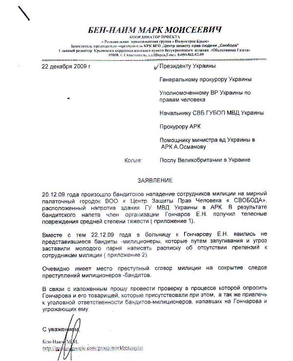 Пострадавший от милицейского налета на палаточный городок в Симферополе ЕВГЕНИЙ ГОНЧАРОВ, заявляет о новых милицейских провокациях. На этот раз милиция запугивала Евгения Гончарова при свидетелях на территории симферопольской больницы. Евгений Гончаров, пострадавший от бандитского налета милиции на мирный палаточный городок ВОО «Центр Защиты Прав Человека «СВОБОДА», размещенный напротив Крымского главка милиции, заявляет о милицейских угрозах в свой адрес. По словам Евгения Гончарова, примерно в 16 часов 22 декабря к нему в больницу прибыли пять сотрудников милиции, один из которых был в форме. В присутствии друзей Евгения Гончарова, которые пришли навестить парня, сотрудники милиции окружили его, запретили звонить по мобильному телефону, и путем угроз и шантажа заставили написать расписку об отсутствии претензий к сотрудникам милиции в связи с полученными им травмами 20 декабря. О произошедшем был немедленно проинформирован дежурный по Крымскому главку милиции, который однако не принял никаких мер. По данному факту, на основании заявления Евгения Гончарова, мною направлены заявления высшим должностным лицам Украины, сообщил правозащитник. Напоминаем, что в ночь на 20 декабря пятеро неизвестных, представившихся сотрудниками милиции, разрушили палаточный городок Крымского регионального комитета ВОО «Центр защиты прав человека «Свобода» напротив Главного управления МВД Украины в АРК и избили участника акции протеста Евгения Гончарова. Об этом он сообщил корреспонденту Крымского информационного агентства.