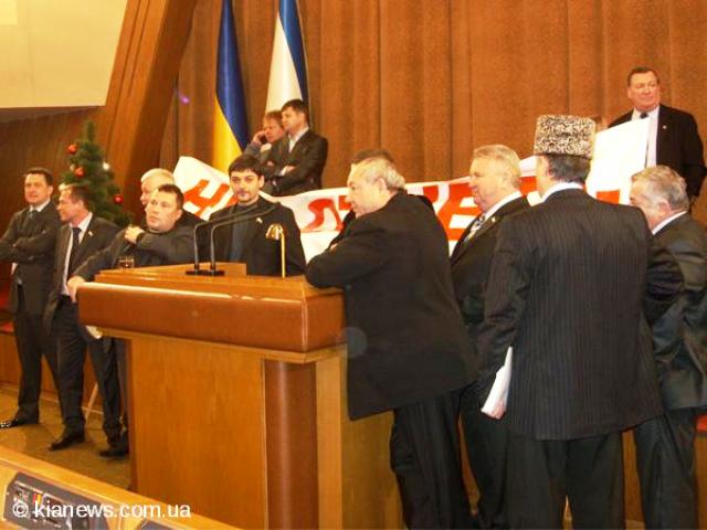 Сегодня перед началом пленарного заседания сессии крымского парламента депутаты-оппозиционеры заблокировали трибуну президиума и потребовали включить в повестку дня два вопроса: об отчете Совета министров АРК и переименовании Верховной Рады в Верховный Совет.