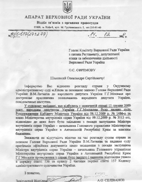 11.12.09 Г.Москаль предоставил в Окружной Административный Суд г. Киев Распоряжение Кабинета Министров Украины No. 1486-р и Приказ министра вд Украины No. 3113 о/с ( приложения 1 и 2). Отмечается особо, что Москаль предоставил эти документы в суд лично. Как следует из документов, Г.Г.Москаль уволен с должности заместителя министра-начальника ГУ МВД Украины в АРК еще 08.12.09 года.