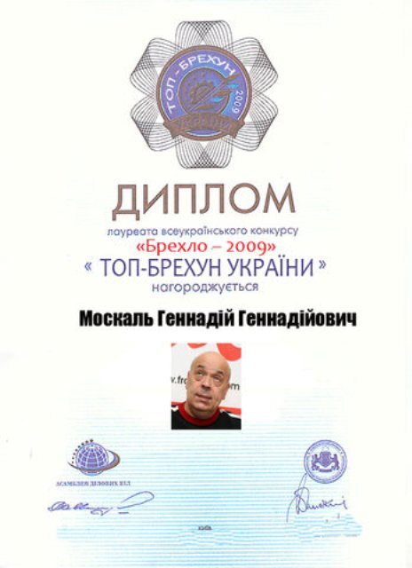 Как стало известно из хорошо информированных источников информационному агентству «Старый регион», имя Геннадия Москаля вошло в первую десятку кандидатов на получение престижной Всеукраинской премии «Брехун года – 2009».  Победителю этого престижного Всеукраинского конкурса будет вручен диплом «Брехун года - 2009» и авиабилет до Гондураса. Организаторы конкурса утверждают, что таким образом они решили отметить многолетние успехи в развитии фантастического направления эпистолярного жанра украинского чиновничества и огромный личный вклад Геннадия Москаля по продвижению стопроцентной брехни в массы. Номинировать на первый приз в этом престижном Всеукраинском конкурсе писателей - фантастов Геннадия Москаля предложил сам Усама Бен-Ладан (Ладен) через своего полномочного представителя на Украине и в Крыму Марка Бен-Наима. И это не случайно. По слухам, Геннадий Москаль самолично сочинил некую оду Марку Бен-Наиму и арестовал в Крыму бомжей, прикидывавшихся соратниками самого Усамы Бен-Ладена (Ладена). По версии Москаля эти воры-неудачники мелкого и крупного рогатого скота замышляли совершить теракт в отношении самого Мустафы Джемилева. По данным РИА «Старый регион» эту шутку высоко оценил Усама Бен-Ладен (Ладан), и предложил своим соратникам объявить Геннадия Москаля победителем конкурса и назначить его приказом Юрия Луценко на должность главного евнуха Гондураса.