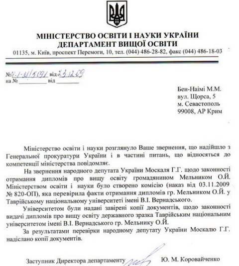 Начальник крымской милиции Геннадий Москаль сознательно оклеветал депутата Верховной Рады АРК Александра Мельника.  Об этом сообщает пресс-группа проекта «Региональная правозащитная группа «Полуостров Крым» со ссылкой на заместителя директора департамента высшего образования Министерства образования и науки Украины Юрия Коровайченко. Как отметили в пресс-группе, он утверждает, что ведомство создало специальную комиссию по проверке подлинности диплома о высшем образовании Александра Мельника, которая установила факт законности документа. В пресс-группе добавили, что результаты проверки были направлены начальнику Главка МВД Крыма. «Из письма следует, что Геннадий Москаль прекрасно знал о том, что диплом депутата крымского парламента Александра Мельника абсолютно законен, но, тем не менее, продолжал клеветать на депутата», – отметили в пресс-группе. И заявили: «Подобные действия Москаля в очередной раз доказывают, что главной его задачей в Крыму является не борьба с преступностью, а поливание грязью законно избранных крымских депутатов и членов правительства Крыма». Напомним, Главное управление МВД Украины в АРК обратилось к министру образования и науки Украины Ивану Вакарчуку с просьбой о создании комиссии по проверке законности получения диплома Таврического национального университета имени В.И. Вернадского по специальности «география» депутатом Верховной Рады АРК Александром Мельником. КИА.