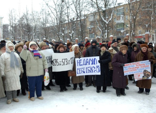 Киев. Правительство Юлии Тимошенко в январе 2010 года недоплатило каждому пенсионеру от 150 до 300 гривен пенсии. Сегодня во всех областных центрах Украины прошли акции протеста пенсионеров, требующих выполнения закона о повышении социальных стандартов.  Прошла такая акция и возле Центрального офиса Пенсионного фонда Украины в Киеве. - Люди получили пенсии в размерах прошлого года. Между тем, минимальная пенсия с 1 января установлена в размере 695 гривен, что на 122 гривны выше, чем декабрьский ее размер. Кроме того, следует учесть, что надбавки и повышения к пенсиям таких категорий пенсионеров, как, к примеру, «дети войны», участники ВОВ, жертвы нацистских преследований, доноры и т.д. также устанавливаются, исходя из размера минимальной пенсии. То есть в среднем каждый пенсионер в январе уже недополучил от 150 до 300 гривен повышенной в соответствии с принятым законом пенсии, - подчеркнул народный депутат, заместитель Председателя Партии регионов, министр труда и социальной политики в Оппозиционном правительстве Михаил Папиев. Политик также сообщил, что 23 декабря Кабинет Министров Украины принял постановление № 1375, которым распорядился выплачивать пенсии в прежнем размере, то есть - без какого-либо повышения.