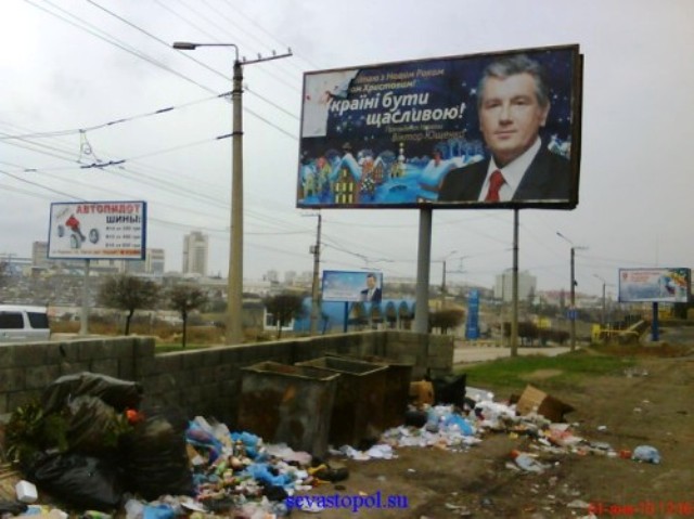 Выборы президента Украины. Крым. Севастополь.  Небывалый скандал разразился в городе - герое Севастополе, где Виктор Ющенко руководителем городской госадминистрации назначил Сергея Куницына. Специалисты по рекламе установили в Севастополе один из билбордов с предвыборной агитацией президента Украины Виктора Ющенко возле кучи мусора, пишет ForPost. "Украине – быть счастливой!" - оптимистично утверждает подретушированный президент с рекламно-новогоднего плаката, установленного в аккурат над помойкой на пересечении улиц Харьковской и Руднева в Севастополе. Издание предполагает, что заказчики и исполнители «президентской предвыборной кампании», скорее всего, просто не обратили внимания на расположение рекламного щита. По другой версии, к установке предвыборного бигборда Виктора Ющенко на мусорнике приложили свои руки сторонники Юлии Тимошенко. Интересно, а куда смотрел Сергей Куницын или он тоже уже считает Виктора Ющенко отработанным материалом?