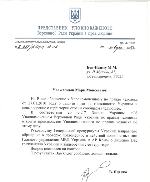 НИНА КАРПАЧЕВА ВСТАЛА НА ПУТИ ЛУЦЕНКОВСКО-МОСКАЛЬСКИХ ФАЛЬСИФИКАТОРОВ, ПЫТАВШИХСЯ НЕЗАКОННО ЛИШИТЬ ГРАЖДАНСТВА УКРАИНЫ ИЗВЕСТНОГО КРЫМСКОГО ПРАВОЗАЩИТНИКА МАРКА БЕН-НАИМ.  Уполномоченный Верховной Рады Украины по правам человека Нина Карпачева открыла производство по делу о нарушении Конституционных прав Крымского правозащитника и журналиста Марка Бен-Наим. Соответствующее представление направлено Украинским омбудсменом в адрес Генерального прокурора Украины, а рассмотрение вопроса поставлено на контроль. Об этом сообщил правозащитнику Представитель Уполномоченного Владимир Яценко. Как показала проверка, проведенная юристами Секретариата Нины Карпачевой, 19.01.2010 года некий начальник сектора ОВИР Крымского главка милиции майор милиции Савануполо, превысив свои полномочия и нарушив Конституционные права гражданина Украины, вынес решение о прекращении гражданства Марка Бен-Наим. При этом обнаглевший майор отменил гражданство Украины на том основании, что якобы Марк Бен-Наим имеет гражданство Российской Федерации. При этом никаких документов от РФ о наличии такого гражданства у Марка Бен-Наим не имеется в природе. Изучение вопроса в Секретариате Уполномоченного привело к однозначному выводу о том, что майор не имел права выносить подобных решений. При этом другой начальник сектора ОВИР - начальник Алупкинского ОВИР Ялтинского горотдела милиции майор Акулич, основываясь на незаконном решении майора Савонуполо, вынес решение о выдворении Марка Бен-Наим с территории Украины. Майора Акулича совсем не смутил тот факт, что майор Савануполо не имел права выносить решений о прекращении гражданства.