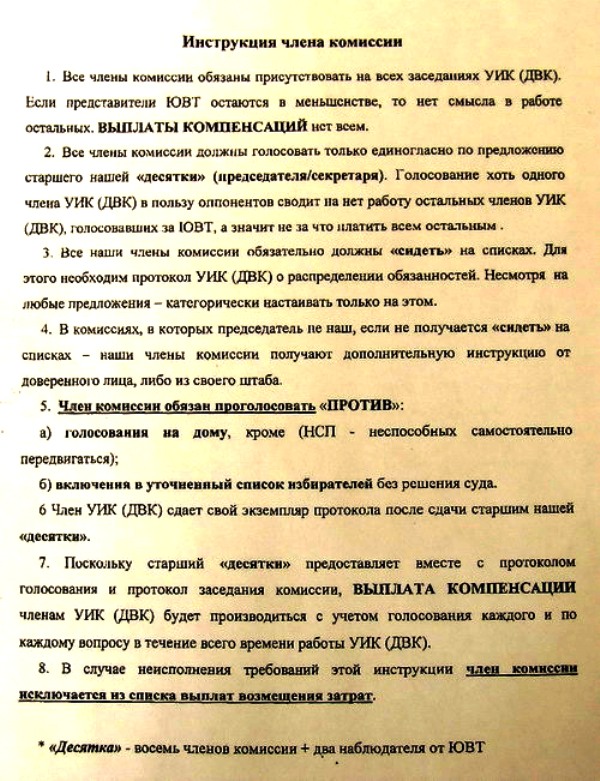 Киев. Донецк. Крым. Срочно. Стали известны очередные противозаконные «наставления» из штаба Юлии Тимошенко членам избирательных комиссий и наблюдателям от Юлии Тимошенко.  Оказалось, что членам избиркомов и наблюдателям, представляющим Юлию Тимошенко, дополнительную зарплату из "черной кассы" будут платить только в том случае, если они будут активно противодействовать волеизъявлению избирателей в Крыму и в восточных регионах Украины. Причем, в штабах Юлии Тимошенко ввели коллективную ответственность для членов избиркомов и наблюдателей. В инструкции, копией которой располагает "Крымский аналитик" в частности говорится: "Все члены десятки (восемь членов комиссии и два наблюдателя от Тимошенко) должны голосовать только единогласно по предложению старшего нашей десятки (председателя\ секретаря). Голосование хоть одного члена УИК (ДВК) в пользу оппонентов сводит на нет работу всех остальных членов УИК (ДВК), голосовавших за ЮВТ, а значит, не за что платить всем остальным. Все наши члены обязательно должны сидеть на списках. Для этого необходим протокол УИК (ДВК) о распределении обязанностей. Несмотря на любые предложения - категорически настаивать на этом. ЧЛЕН КОМИССИИ ОБЯЗАН ПРОГОЛОСОВАТЬ "ПРОТИВ": а) голосования на дому, кроме НСП - неспособных самостоятельно передвигаться). б) включение в уточненный список избирателей без решения суда. Подробнее о противозаконных инструкциях избирательных штабов Юлии Тимошенко смотрите на прилагаемой фотокопии документа. Доверенные лица Виктора Януковича обратились в Генеральную прокуратуру Украины с просьбой дать юридическую оценку ИНСТРУКЦИИ ЧЛЕНА КОМИССИИ от Юлии Тимошенко.