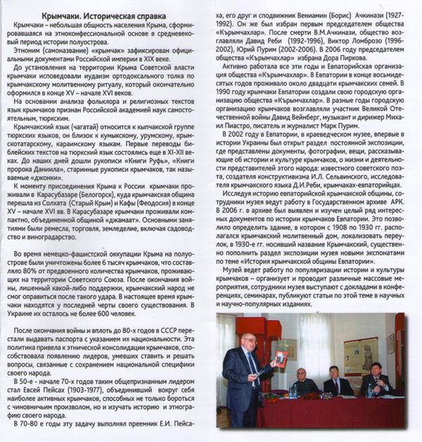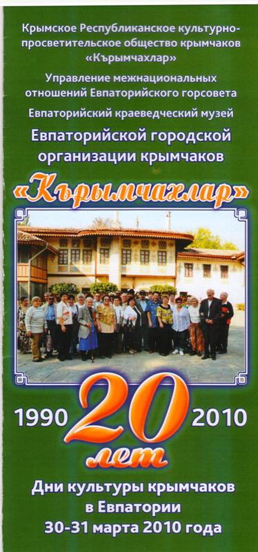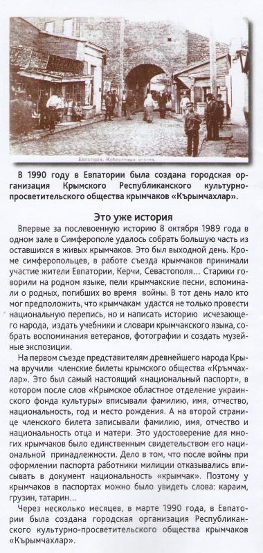 Сегодня, 30 марта в 15 часов в Евпаторийском краеведческом музее состоится открытие Дней крымчакской культуры. Дни крымчакской культуры в Крыму посвященны 20-летию создания Евпаторийской городской организации крымчаков «Кърымчахлар».  30-31 марта Управление межнациональных отношений Евпаторийского горсовета, Евпаторийский краеведческий музей совместно с крымским Республиканским обществом "Кърымчахлар" проводят Дни крымчакской культуры в Евпатории. Сегодня «Крымский аналитик» начинает публикацию материалов, посвященных Дням крымчакской культуры в Крыму. 20 лет назад при Фонде культуры в Симферополе было создано Крымское Республиканское культурно-просветительское общество крымчаков «Кърымчахлар» (крымчаки). Впервые за послевоенную историю 8 октября 1989 года в одном зале в Симферополе удалось собрать, большую часть из оставшихся в живых крымчаков. Это был выходной день. Кроме симферопольцев, в работе съезда крымчаков принимали участие жители Евпатории, Керчи, Севастополя… Старики говорили на родном языке, пели крымчакские песни, вспоминали о родных, погибших во время войны. В тот день мало кто мог предположить, что крымчакам удастся не только провести национальную перепись, но и написать историю исчезающего народа, издать учебники и словари крымчакского языка, собрать воспоминания ветеранов, фотографии и создать музейные экспозиции. На первом съезде представителям древнейшего народа Крыма вручили членские билеты крымского общества «Кърымчахлар». Это был самый настоящий «национальный паспорт», в котором после слов «Крымское областное отделение украинского фонда культуры» вписывали фамилию, имя, отчество, национальность, год и место рождения. А на второй странице членского билета записывали фамилию, имя, отчество и национальность отца и матери. Это удостоверение для многих крымчаков было единственным свидетельством его национальной принадлежности. Дело в том, что после войны при оформлении паспорта работники милиции отказывались вписывать в документ национальность «крымчак». Поэтому у крымчаков в паспортах можно было увидеть слова: караим, грузин, татарин…