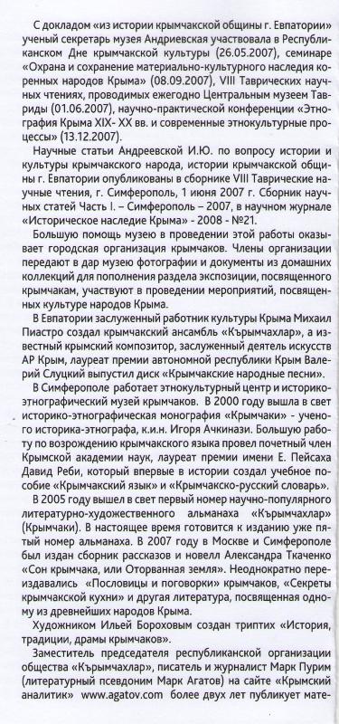 С докладом «из истории крымчакской общины г. Евпатории» ученый секретарь музея Андриевская участвовала в Республиканском Дне крымчакской культуры (26.05.2007), семинаре «Охрана и сохранение материально-культурного наследия коренных народов Крыма» (08.09.2007), VIII Таврических научных чтениях, проводимых ежегодно Центральным музеем Тавриды (01.06.2007), научно-практической конференции «Этнография Крыма XIX- XX вв. и современные этнокультурные процессы» (13.12.2007).