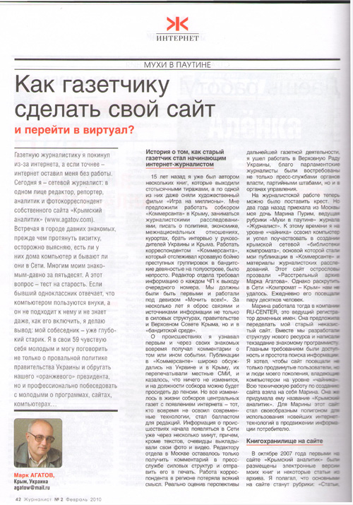 ImageСтатья из журнала "Журналист". Газетную журналистику я покинул из-за интернета, а если точнее - интернет оставил меня без работы. Сегодня я - сетевой журналист: в одном лице редактор, репортер, аналитик и фотокорреспондент собственного сайта «Крымский аналитик» (www.agatov.com). Встречая в городе давних знакомых, прежде чем протянуть визитку, осторожно выясняю, есть ли у них дома компьютер и бывают ли они в Сети. Многим моим знакомым давно за пятьдесят. А этот вопрос - тест на старость. Если бывший одноклассник отвечает, что компьютером пользуются внуки, а он не подходит к нему и не знает даже, как его включить, я делаю вывод: мой собеседник - уже глубокий старик. Я в свои 59 чувствую себя молодым и могу поговорить не только о провальной политике правительства Украины и обругать нашего «оранжевого» президента, но и профессионально побеседовать с молодыми о программах, сайтах, компьютерах... История о том, как старый газетчик стал начинающим интернет-журналистом. 5 лет назад я уже был автором нескольких книг, которые выходили стотысячными тиражами, а по одной из них даже сняли художественный фильм «Игра на миллионы». Мне предложили работать собкором «Коммерсанта» в Крыму, заниматься журналистскими расследованиями, писать о политике, экономике, межнациональных отношениях, курортах, брать интервью у руководителей Украины и Крыма.
