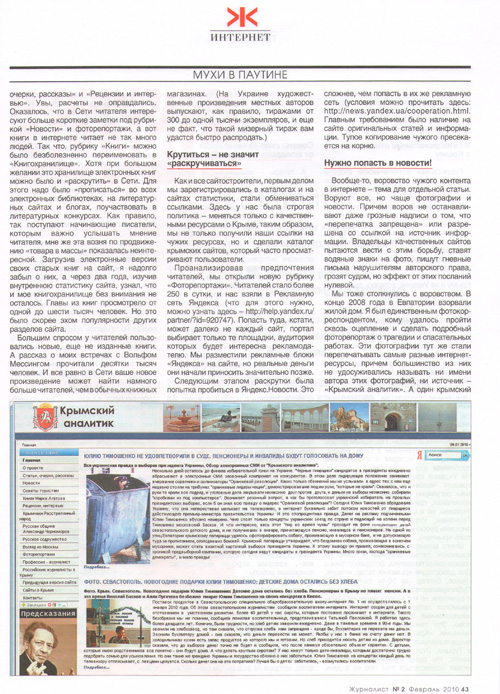 Мы тоже столкнулись с воровством. В конце 2008 года в Евпатории взорвали жилой дом. Я был единственным фотокорреспондентом, кому удалось пройти сквозь оцепление и сделать подробный фоторепортаж о трагедии и спасательных работах. Эти фотографии тут же стали перепечатывать самые разные интернет-ресурсы, причем большинство из них не удосуживались называть ни имени автора этих фотографий, ни источник «Крымский аналитик». А один крымский новостной ресурс поместил несколько десятков моих фотографий (естественно, без разрешения автора и редакции сайта) под рубрикой «Фотоконкурс», существенно подняв рейтинги своего ресурса.