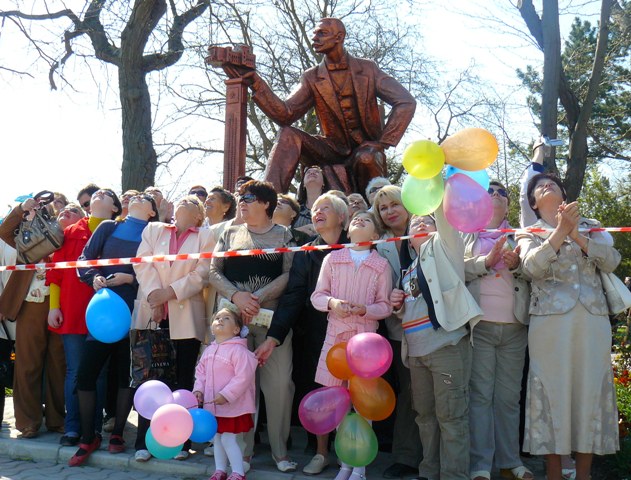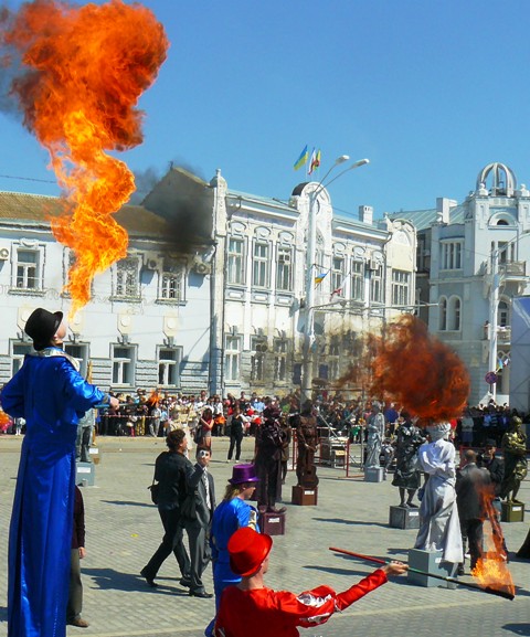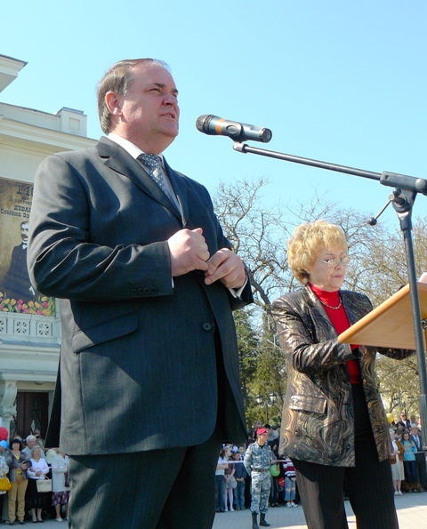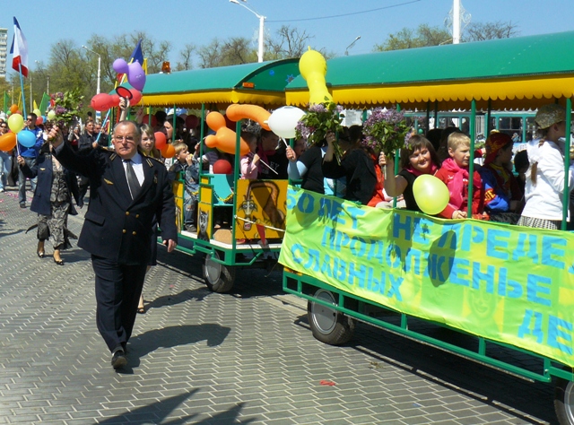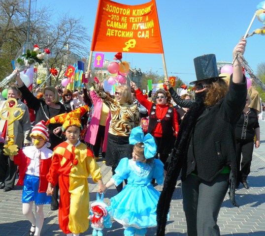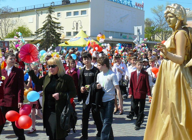 Евпатория открытие курортного сезона 2010Фото. Первое мая в Евпатории. Самыми первыми на  площадь  пришли «живые скульптуры». Они долго выбирали место, поправляли одеяния, грим, а потом замерли на долгие два часа, пока мимо трибуны нескончаемым потоком перемещался  ликующий евпаторийский народ. О живых скульптурах мы поговорим с вами отдельно, вернее, покажем их несколько позже, также, как и танцующих на ходулях евпаторийских великанов.  К сожалению, это танцевальное шоу удается наблюдать только зрителям, а не участникам демонстрации. Поэтому мы и для него  выделим отдельное место на сайте. А сейчас, «Крымский аналитик» предлагает посмотреть на фотографии тех, кто решил вспомнить свою советскую молодость, выстроился  в колонны и с песнями, шутками и улыбками отправился на Первомайскую демонстрацию по улицам Евпатории. Крымский папарацци перечитал последнюю фразу своего эпохального текста, и вдруг осознал, что он врет самым наглым образом. Ну, какую «советскую молодость» мог вспомнить десятилетний школьник, или двадцатилетний «ударник капиталистического труда» в Евпатории? Да они и про советскую власть-то толком ничего не знают, и о традициях своего народа слышали только из уст родителей. Но именно молодые люди Евпатории составляли большинство в праздничных колоннах. К ним, в большой степени,  было обращено  и выступление городского головы Евпатории Андрея Даниленко, который поздравив горожан с открытием курортного сезона, напомнил, что на них возложена непростая миссия проявить гостеприимство к нашим главным кормильцам – туристам из дальнего и ближнего зарубежья, которые каждое лето выбирают для отдыха Евпаторию. А потом над площадью зазвучали призывы и здравицы штатного евпаторийского Нептуна и ведущей всенародного торжества Светланы Гейс. Не обошлось на демонстрации и без акции протеста.