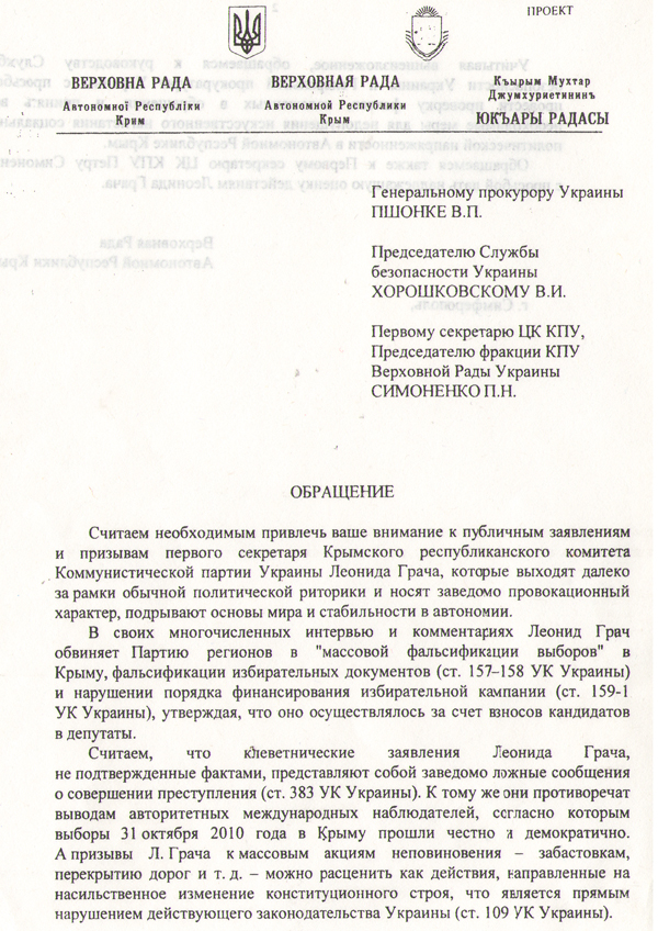 Леонида Грача хотят отправить в СИЗО за призывы к свержению конституционного строя. Крымский парламент обратился к Генпрокурору, главе СБУ и лидеру Компартии Украины провести проверку и дать оценку заявлениям главного коммуниста Крыма Леонида Грача. Депутаты Верховного Совета АРК считают, что в них содержатся призывы к насильственному свержению конституционного строя. Заявление от имени Верховного Совета Крыма с трибуны огласил глава комиссии по вопросам регламента и организационной работы Ефим Фикс, который ранее неоднократно публично упрекал Грача в политической трусости и дешевом популизме. В обращении отмечается, что заявления Грача о фальсификации результатов местных выборов в Крыму в пользу Партии регионов выходят за рамки обычной политической риторики и носят заведомо провокационный характер, подрывая тем самым «основы мира и стабильности в автономии». «Эти клеветнические заявления можно приравнять к заведомо ложным обвинениям в совершении преступления, – говорится в документе. – К тому же, они противоречат выводам международных наблюдателей о том, что выборы в Крыму прошли честно и демократично». Призывы Грача к массовым акциям неповиновения депутаты расценили как действия, направленные на насильственное изменение конституционного строя, что является прямым нарушением закона. В связи с этим парламентарии просят Генпрокуратуру и СБУ провести проверку по изложенным фактам, а лидера КПУ Петра Симоненко – дать оценку действиям Грача. Данное обращение поддержали 75 депутатов.