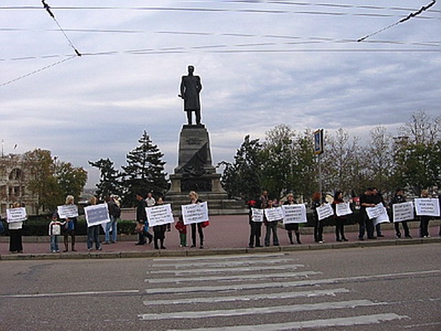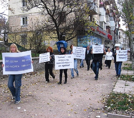 Севастополь акция протестаВ Севастополе прошла акция за безопасность движения на дорогах. В ней приняло участие около 30 молодых людей и столько же автомобилистов. Акция началась с минуты молчания в память о погибших 21 ноября –– молодой матери с двумя детьми 2-х и 5-ти лет. Их сбил на тротуаре игрок местного футбольного клуба «Севастополь» Владислав Пискун.  Пешая колонна прошла от места гибели невинных жертв на улице Гоголя до площади Нахимова. Молодые люди несли плакаты: «Я боюсь переходить дорогу», «Хватит торговать нашими жизнями», «Сбавь скорость, огорчи смерть» и другие. Во время прохождения по улице Большой Морской пеший марш несколько раз встречался с колонной автопробега. На машинах были прикреплены плакаты аналогичного содержания. Автомобили громко сигналили. На площади Нахимова все участники акции поставили подписи под обращением к городским властям. В этом документе севастопольцы требуют считать важнейшим критерием оценки работы ГАИ не количество составленных протоколов, а уменьшение количества погибших и покалеченных на дорогах. Под подобным документом могли бы подписаться не только севастопольцы, но и жители других городов и поселков Крыма и Украины. Кроме безголовых мажоров, устраивающих автогонки по улицам крымских городов с кровавым финишем, особую опасность для пассажиров и пешеходов последнее время стали представлять и технически неисправные автобусы.