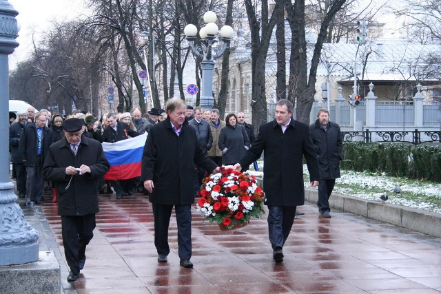 На Фото: От имени участников Всеукраинской Конференции организаций российских соотечественников и Представительства Россотрудничества корзину с цветами к памятнику Н.Ф.Ватутину возлагают руководитель Представительства Россотрудничества на Украине К.П.Воробьев и председатель ВКСОРС, народный депутат Украины В.В.Колесниченко. Фото «Русской Правды».