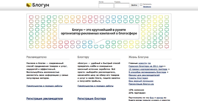 Рекламодатели Темы охотно делятся результатами размещения рекламы в этом блоге. Так одна компания получила 7600 посетителей, это 52% трафика их сайта. «Помимо траффика на сайт, благодаря сотрудничеству с Вами был всплеск посещений нашего ЖЖ — 46700 посетителей в начале октября. Как промежуточный итог — в настоящее время обсуждается несколько контрактов на общую сумму в несколько раз превосходящую затраты на рекламу в Вашем ЖЖ». «За неделю мы получили порядка 700 регистраций, что достаточно неплохо, учитывая специфику сервиса и то, что это была просто реклама, а не промо-акция, — пишет другой рекламодатель, — Стоимость регистрации получилась примерно в 2 раза выше, нежели в контексте, но мы не забываем также про медийный эффект — теперь нас узнают на улице :)». Рекламный пост у фотографа russos стоит 15 000 рублей. Каждый день его блог читает от 6000 до 20000 уникальных посетителей. «Фотосъёмки и ведение блога из хобби постепенно превратились в работу. А работа должна приносить доход», — уверен он. Стоимость рекламного поста у фотографа zyalt — 30000 рублей. За 500 рублей он высылает свои фотографии в большом разрешении. Решился на размещение рекламы в своем блоге и drugoi. Как и остальные, он объясняет свое решение тем, что ведение блога отнимает много времени и сил, и эта работа должна приносить деньги. Если у вас посещаемый ресурс, возьмите этих блогеров за образец, посмотрите, как оформлены профили их дневников и заглавные посты. Обычно там есть ссылки на лучшие материалы, на теги, по которым можно прочитать все на одну тему, на список стран, в которых они были (если это фотографы). Разумно разместить там ссылку на статистику своего блога и расценки на рекламу. Из уважения к читателям оплаченные посты нужно выделять отдельным тегом. Рекламодатели для каждогоЕсли рекламодатели в ваш блог не ходят, а сам блог не может похвастаться многотысячной аудиторией, но пара сотен постоянных читателей у вас есть, зарегистрируйтесь на Блогуне. Предложения там можно искать по ключевым словам, минимальной и максимальной цене, типам поста и другим параметрам. Если задание нравится, но стоимость поста не устраивает, можно попробовать поторговаться с рекламодателем. Нужно быть готовым к тому, что требования у заказчика могут оказаться очень неожиданными. Почти наверняка он попросит разместить в посте активную ссылку с текстом, который нужен ему для оптимизации в поисковых системах. Решать вам, украсит ли ваш блог ссылка вроде «пластиковые окна киев дешево» или «лингвальные брекеты». Реклама через «Блогун» — это скрытая реклама, пометить ее тегом «реклама» будет нельзя, напротив, нужно будет всеми силами убеждать своих читателей, что вы реальный поклонник зубных протезов фирмы «Зубкинс». По каждому предложению можно посмотреть статистику. Например, фирма, которая чинит компьютеры, за один пост предлагает до 3000 рублей, правда, в среднем (судя по статистике), платит блогерам 215 рублей. Тем не менее 34 человека уже выполнили задание. «Никаких подвохов сначала не было, — делится опытом один блогер, зарабатывающий на Блогуне, — Особенно было хорошо, пока они в долларах считали. Там реально были посты по 500 у.е!!! Правда, такие поручали тысячникам. Мой максимальный заработок за пост был, по-моему, долларов 100-150. Потом они перешли на рубли. Пошли неинтересные копеечные предложени