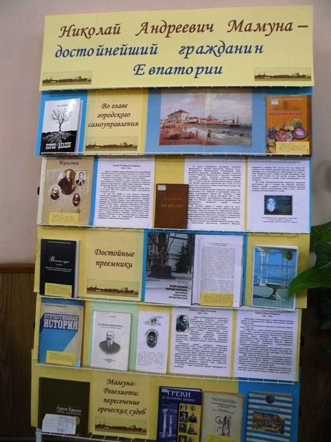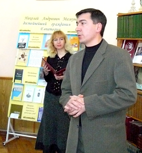 Презентация книгиКнига эта посвящена жизни, и деятельности первого городского головы Евпатории графа Мамуны Н.А. Об этом человеке до выхода этой книги информации  было совсем немного. В Сети я отыскал лишь короткую справку о том, что с 1886г. по май 1906г. первым городским головой был граф дворянин Мамуна Н.А. (1844-1916). Избирался городским головой 5 раз подряд. За этот период к концу XIX в. сформировался административно-торговый центр Евпатории, Главные улицы города - Земская, Лазаревская и Фонтанная (ныне ул. Революции). Открыто английское, испанское, французское и турецкое консульства. Функционировал Санкт-Петербургский Международный Коммерческий Банк, различные кредитные учреждения. Работала таможня, Агентство Русского Общества Пароходства и Торговли, увеличился грузооборот порта, построены пристани, налажено пароходное сообщение с Одессой, Ялтой, Севастополем. В 1891г. открыта частная (первая) гидрометеорологическая станция. Получил развитие курорт. В 1886г. открыта Мойнакская грязелечебница. В 1905г. открыта первая в России частная "Приморская санатория" (ныне санаторий им. Ленина). Поэтому было любопытно послушать рассказ о том, как управлял городом Мамуна Н.А.  Автор книги, краевед Ирина Слепкан рассказала не только о самом евпаторийском градоначальнике, но и о трагической судьбе его потомков. Многие из них были репрессированы после революции, поэтому собирать материал о Мамуне было непросто.