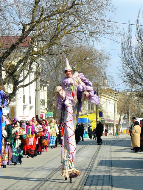 Евпатория 2011 масленицаКто придумал название для евпаторийского действа «ШИРОКАЯ МАСЛЕНИЦА» на театральной площади в Евпатории мне узнать так и не  удалось. Никто из организаторов ничего не слышал и про «УЗКУЮ МАСЛЕНИЦУ», а известный крымский фотохудожник Юрий Теслев, прославившийся на всю Сеть своими фоторепортажами из Израиля, посоветовал не искать особого смысла в названиях: широкая - узкая. И вправду, зачем искать разницу в словах, когда прямо с утра по улице Революции в Евпатории прошел по трамвайным рельсам «Масленичный поезд», так организаторы назвали «шествие творческих коллективов и участников праздника по улицам города». Понятно, что крымский папарацци» сначала запечатлел Революцию в деталях, а потом и выступление фольклорных коллективов «как на Масленой неделе». Сельские и районные клубы горожан повеселили от душа, вот только затянули выступление так, что часть зрителей, вначале снесла ограждение, чтобы быть ближе к сцене, а потом и вовсе разошлась по прилегающим к площади улицам. Кстати, на Дувановской было не менее интересно, чем на площади. Можно было  позировать фотографам с живыми скульптурами из Евпаторийского центра досуга, приобрести блинов и кое-что покрепче. А еще мне удалось запечатлеть мужчину в иноземной военной форме и пытающихся забраться на самый верх по отполированному столбу юных евпаторийцев.