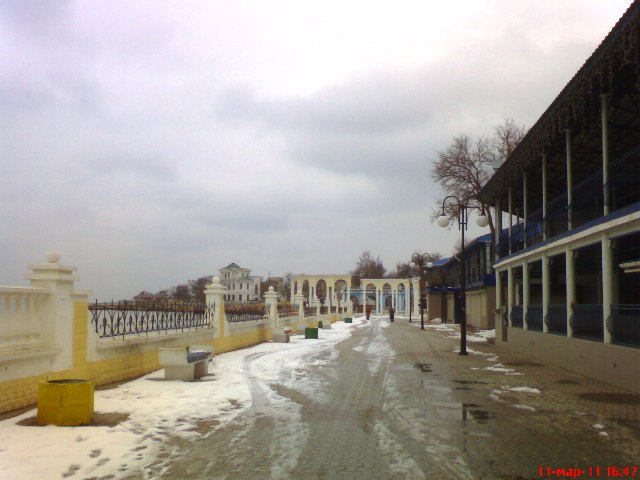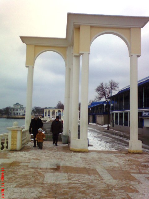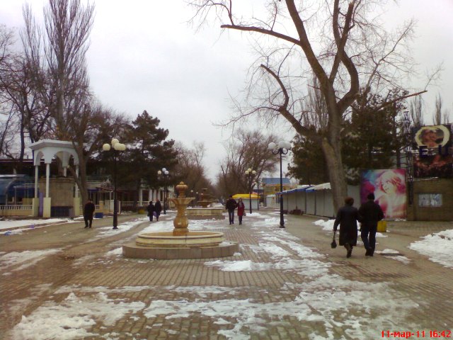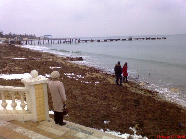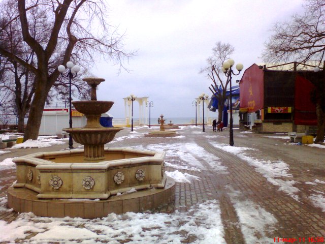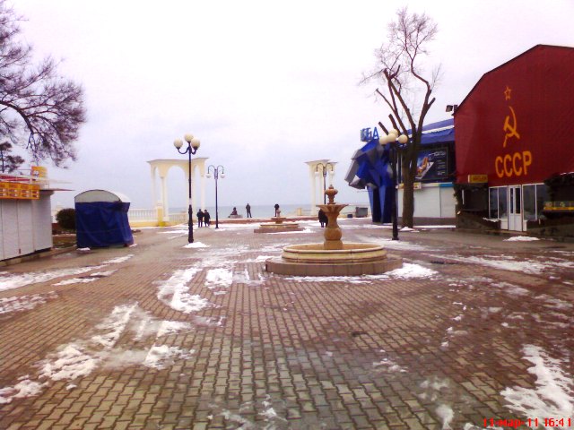 Евпатория ностальгияТе, кто уехал, частенько вспоминают родной город. И, вроде бы, Евпатория проигрывает Москве, Санкт-Петербургу, Тель-Авиву, но что-то притягательное есть в этом городе. И не только слова: Родина, Малая Родина. Даже в зимний холод в Евпатории лучше, чем в Москве. Не нужно преодолевать сугробы, стоять в многокилометровых пробках, набиваться в вагоны метро, чтоб доехать до работы. Но, больше всего в Москве давит на человека - закрытое серыми облаками небо. Те, кто уехал, рассказывают своим коллегам о том, что в Евпатории круглый год можно увидеть прозрачное небо  и солнце над морем. Я бреду по пустынным улицам, на которых умирает евпаторийская  зима. Клочья снега разбросаны по тротуару. В парке Фрунзе пустынно, даже художники не стали выставлять свои картины. Сегодня последний день зимы. Синоптики божатся, что  в Евпаторию она больше не вернется. Я снимаю на мобильник застывший фонтан, заваленный черной тиной пляж,  и столовую №1 в которой ждут посетителей с 8 до 22-х. Но пока она закрыта. Стоит подойти ближе, и из-за кухонной плиты, раздается злобный лай пса – охранника. Умирает зима в Евпатории. На фотографии 11 марта 2011 года, 16 часов 53 минуты.