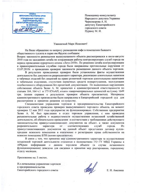 «Крымский аналитик» решил опубликовать не только фотографии, сделанные вчера в «туалете-кафе» (как оказалось, там еще можно справить нужду за наличные),  но и письмо и.о. начальника управления торговли и предпринимательства Евпаторийского городского совета Е.Н. Амелиной, полученное депутатом Евпаторийского горсовета Пурим М.И.  Очень интересный документ. Советуем прочитать всем, кто отправляется на отдых в парк имени Фрунзе.