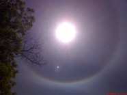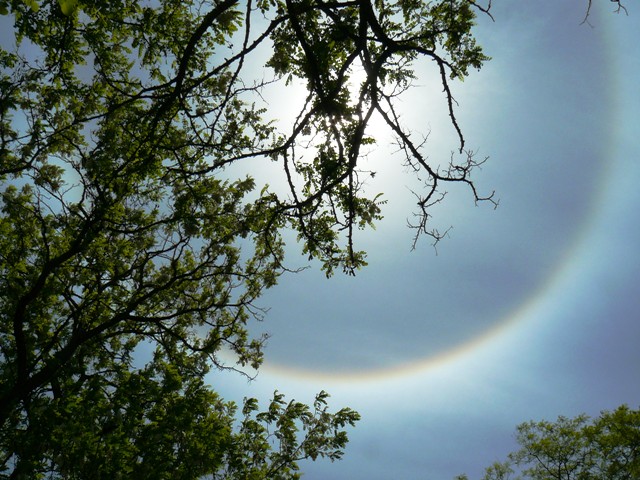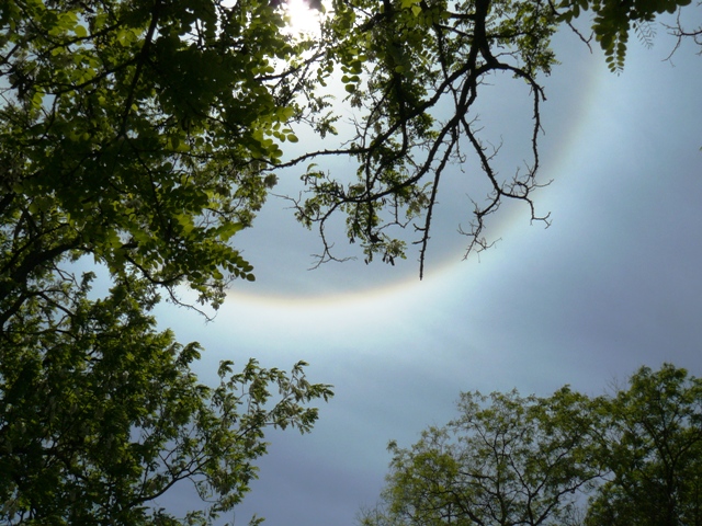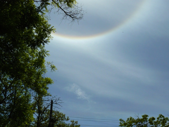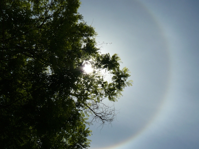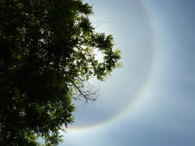 В Крыму, в Чернополье греческий праздник солнце отметило "круглой радугой".  Посмотрев на солнце вы никогда не увидете радугу, но вот в Крыму крымскому папарацци удалось запечатлеть радугу вокруг солнца. Но для начала несколько умных мыслей о радуге из Википедии. Ра́дуга — атмосферное оптическое и метеорологическое явление, наблюдаемое обычно в поле повышенной влажности. Оно выглядит как разноцветная дуга или окружность, составленная из цветов спектра (глядя снаружи — внутрь дуги: красный, оранжевый, жёлтый, зелёный, голубой, синий, фиолетовый. Эти семь цветов — основные названия цветов, которые принято выделять в радуге в русской культуре, но следует иметь в виду, что на самом деле спектр непрерывен, и цвета эти в радуге переходят друг в друга с плавным изменением через множество промежуточных оттенков. Центр окружности, описываемой радугой, лежит на прямой, проходящей через наблюдателя и Солнце, притом для наблюдателя Солнце всегда находится за его спиной, и одновременно видеть Солнце и радугу без использования зеркал невозможно. Для наблюдателя на земле радуга обычно выглядит как дуга, часть окружности, и чем выше точка зрения наблюдателя — тем радуга полнее (с горы или самолёта можно увидеть и полную окружность). Когда Солнце поднимается выше 43 градусов над горизонтом, то радуга с поверхности Земли не видна. А вот, в Крыму стоило посмотреть на солнце, как перед глазами появлялся круг - радуга вокруг солнца. По одной из версий Радуга вокруг солнца создатся не капельками воды (как обычная радуга), а ледяными кристалликами.