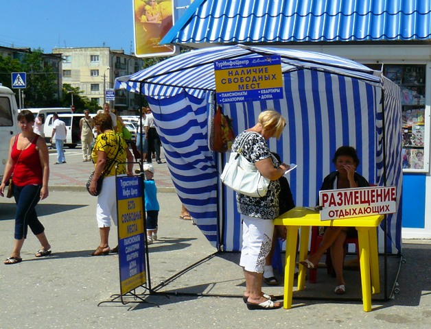 «Отдельные квартиры для туристов у нас примерно одинаковые, — говорит директор турфирмы „Амиго-тур“ Александр Платонов. — Обязательно наличие горячей и холодной воды, холодильника, телевизора, газовой плиты. Во многих квартирах есть микроволновки, кондиционеры. В июне однокомнатную квартиру мы предлагали туристам по цене от 200 гривен в сутки (100 долларов — это 800 гривен, 1 гривна стоит чуть менее 4 рублей). Стоимость возрастала в зависимости от района. У моря квартиры всегда дороже. В июле — августе цена будет выше 250–300 гривен. Можем поселить и в санаторий, пансионат. По сравнению с прошлым годом цены там выросли на 20–30%. В основном они выросли за счет подорожавшего питания. В 2010 году питание в сутки на одного туриста в санаториях и пансионатах было 90 гривен. В 2011 году — 110–120 гривен».