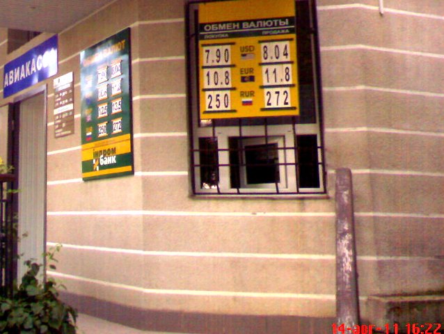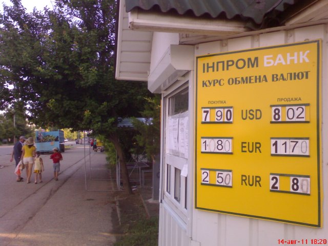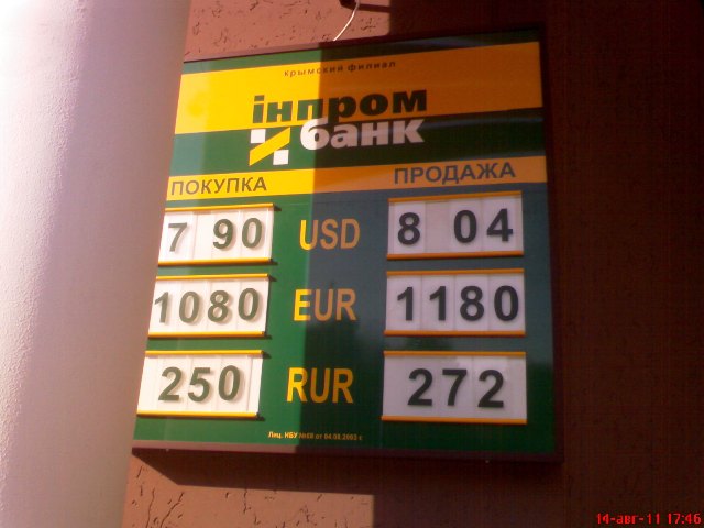 Фото мониторинг обмена валют в Крыму. Курс обмена валют в пунктах обмена валют в Евпатории на 15 августа 2011 года.