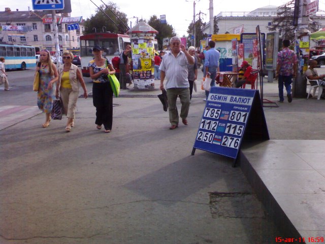 Не меняйте валюту на вокзалах в Симферополе! Вокзальные менялы уравняли в Симферополе богатых авиапассажиров с теми, кто прибыл в Крым на поездах и автобусах. Фото мониторинг курса обмена валют в Симферополе 16 августа 2011 года.