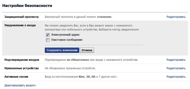 "Крымский аналитик" продолжает рассказ о тайнах Facebook. Если вы переживаете, насколько хорошо защищен ваш аккаунт в социальной сети, зайдите в раздел «Настройки безопасности». Там можно настроить работу Facebook через безопасное соединение, включить опцию получения текстовых сообщений или писем, если в ваш аккаунт вошли с незнакомого компьютера или мобильного устройства. Вы также можете поставить галочки, чтобы каждый раз, когда вы заходите с незнакомого устройства, нужно было подтверждать вход. Тут же можно просматривать сессии, то есть информацию о том, когда и где вы (или не вы) пользовались Facebook. Например, в данный момент система определила, что я нахожусь в Украине, сижу в браузере Firefox в Windows 7 и это соответствует действительности. Есть там даты и время захода для последних сессий. Если вы увидели там что-то подозрительное, например, другой город, другой браузер, время, в которое вы никак не могли быть в интернете, закончите сессии и усильте свои настройки безопасности.