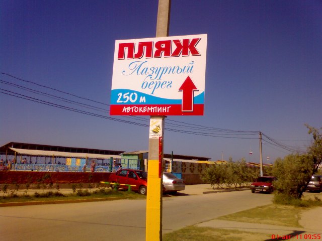 Уважаемый, Андрей Петрович. В районе пересыпи, отделяющей Каламитский залив от озера «Мойнаки» предприниматели построили автостоянку. На указателе написано: «Пляж «Лазурный берег» автокемпинг». У ворот пляжа и в озере «Мойнаки» теперь стоят прямо на песке десятки автомобилей. Сама дорога, по которой ведут на пляжи здравниц детей, стала опасной для пешеходов из-за большого количества автотранспорта, проезжающего к «Лазурному берегу». (Здесь отсутствуют тротуары и детей ведут по дороге). Раньше движение на этом участке было запрещено, и стоял дорожный знак.