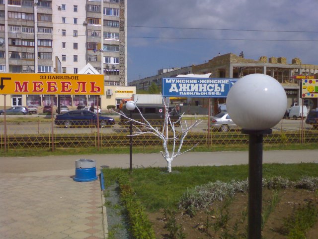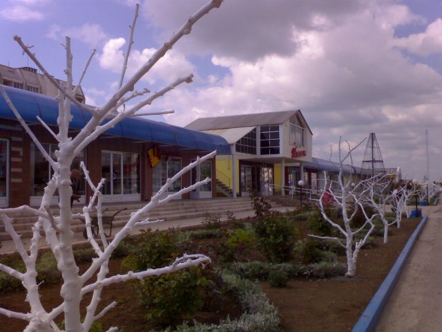 Мы продолжаем нашу заочную фото экскурсию по Евпатории. Это удивительное место я обнаружил в одном из спальных микрорайонов города. От трамвайной остановки в сторону выезда из Евпатории идет аллея с выкрашенными в белый цвет высохшими деревьями. Они резко контрастируют с живыми зелеными кустарниками и молодыми деревцами. Здесь же установлен фонтан, правда, пока он без воды, но старожилы этих мест уверяют, что видели его действующим. Самое удивительное, что этот зеленый рай расположен возле одного из евпаторийских «Пассажей» и призван привлекать покупателей в магазины. Почему меня это удивляет, да потому, что я не видел еще ни одного магазина в городе, хозяева которого не на словах, а на деле заботились о прилегающей территории. Чаще всего разбитый у магазина цветник, через месяц после открытия торговой точки превращается в заросли сорняков, куда водители загоняют свои машины, чтобы облегчить разгрузку товара. Тем же, кто хочет посмотреть на аллею белоснежных деревьев, я советую прогуляться по проспекту Победы или посмотреть на нее через видоискатель моего фотоаппарата.