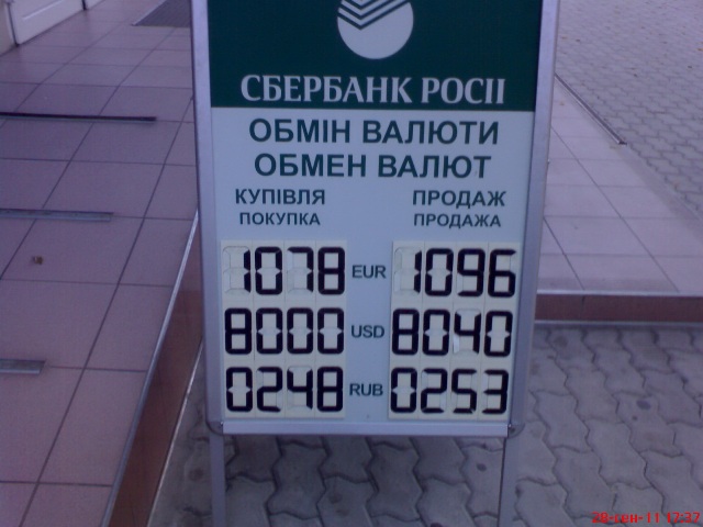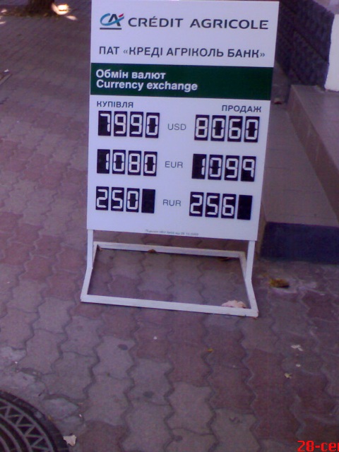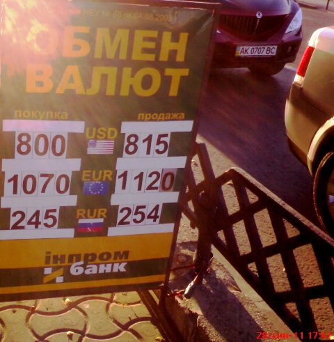 Итак, на 29 сентября 2011 г. Национальный банк Украины установил следующий курс обмена валют: 100 долларов США =797.3600  гривны. 100 евро=1086.8814 гривны. 10  рублей России =2.5060 гривны.  А теперь фото мониторинг курса обмена валют в Евпатории.  Сто долларов США  в Евпатории покупают у граждан за 799-800 гривен. 100 евро за 1060 – 1080 гривен. За 1000 рублей России в Евпатории дают  237-250 гривен.  Тому, кому интересны подробности реального наличного курса обмена долларов США, ЕВРО  и рублей России советуем внимательно рассмотреть прилагаемые фотографии крымского папарацци.