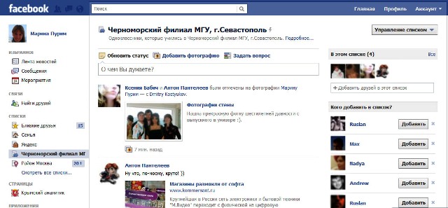 Недавно в Facebook произошли разные изменения, которые касаются внешнего вида профиля пользователя, групп друзей и вообще подхода к чтению своей ленты.  Например, появились списки. Если быть более точной, они существовали и раньше, но работать с ними было не просто. Теперь многое изменилось. Списки дают нам прекрасные возможности: писать только для определенной группы знакомых (как заметили зарубежные журналисты — для тех, с кем у вас «сильный эмоциональный контакт») и читать друзей по группам в зависимости от настроения. Несколько списков появились автоматически — это подборка статусов, фотографий, ссылок от ваших коллег, одноклассников, однокурсников. Они называются смарт-листы. Facebook сгруппировал их, основываясь на информации, указанной в вашем профиле. Списки вы можете найти в левой колонке. Справа от основной ленты вам будут предлагать разных ваших друзей, которых вы тоже можете включить в список. Там же вы видите всех, кто уже включен в группу, и строку, в которой можно вводить имена и тоже добавлять сюда людей. Если вы добавите друга в смарт-лист, Facebook предложит ему обновить свой профиль. Например, тот, кого вы назовете своим однокурсником, получит предложение добавить ваш вуз в раздел «Образование». Он может принять или проигнорировать это предложение.