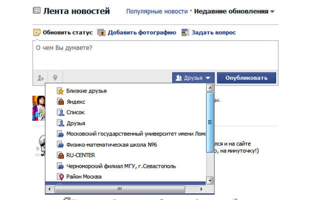 Уделив этой сортировке немного времени, вы получите группы друзей — вот ваши коллеги, вот любимые подружки и друзья, вот члены семьи. Вы будете примерно представлять, сколько человек входит в группу, как часто они пишут и сколько времени отнимет у вас их лента. Если время на чтение новостей у вас ограничено, можно просмотреть, что нового у ваших братьев, сестер, родителей. Если нужно быстро понять, что сегодня самое важное, касающееся вашей работы, — откройте список с коллегами, они уже наверняка наполнили ленту подходящими ссылками. Автоматически Facebook сгруппировал и всех, кто живет с вами в одном регионе, правда, смысл такой группы не очень ясен, ибо, если у ваших друзей есть что-то общее, то 150 ваших знакомых из Москвы — это все равно, что общая лента, которая была у вас раньше, их мало что объединяет, кроме пробок и чекинов в столичных кафе. Но, возможно, кому-то интересен именно такой срез. Статусы про кошечек — только любителям кошечек Вы можете создать свой список, назвать его, как захочется, например, «Домашнее» и постить туда суперважные новости о том, какой пирог вы сегодня испекли, при этом не боятся, что босс причислит вас к отчаянным домохозяйкам и расфрендит.  Когда вы пишете пост, вы можете сразу выбрать группу людей, которой вы хотите его показать. Автор: Марина Пурим.