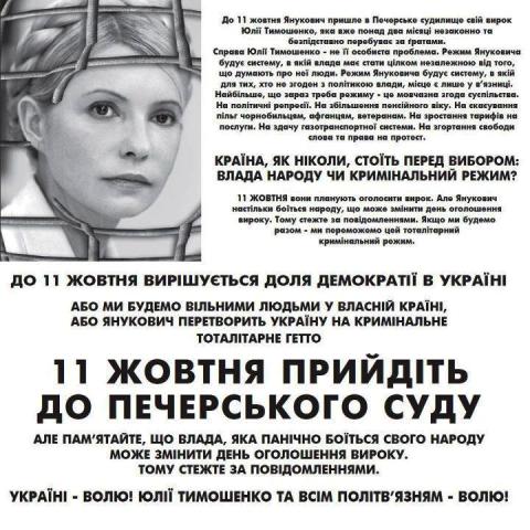 Юлия Тимошенко до конца жизни будет должна Нафтогазу.  В Киеве 11 октября 2011 года судьей Родионом Киреевым был зачитан приговор по делу Юлии Тимошенко. Суд признал Юлию Тимошенко виновной в совершении преступления и приговорил бывшего премьер-министра Украины Юлию Тимошенко в прямом телеэфире к 7 годам лишения свободы. Решение суда также предусматривает последующий запрет Тимошенко занимать должности в государственной власти на протяжении 3 лет. Кроме того, суд обязал ее возместить убытки «Нафтогазу» в размере более 1,5 млрд гривен. Юлия Тимошенко неоднократно прерывала чтение приговора, делала заявления и кричала "Слава Украины". "Слава Украины" кричали и ее сторонники. Но судья не реагировал на крики в зале суда и продолжал читать приговор. - Оппозиция будет обжаловать приговор экс-премьеру Украины Юлии Тимошенко в украинских судах и Европейском суде по правам человека, а также будет апеллировать к людям,- об этом заявил журналистам вице-спикер Верховной Рады, один из лидеров партии "Батькивщина" Николай Томенко. "У нас остается несколько вариантов для действий", - сказал он журналистам возле Печерского райсуда Киева, сообщается на сайте "Батькивщины". По словам Н.Томенко, один из вариантов - парламентский: "Мы регистрируем общие поправки от оппозиции и требуем ликвидации этих статей, которые инкриминируют Юлии Тимошенко". "Мы также будем обжаловать приговор в украинских и европейских судах и в зависимости от ситуации будем обращаться к людям, чтобы они помогли в борьбе, потому что вполне очевидно, что без помощи общества будет очень трудно бороться с этой властью", - отметил политик. Он подчеркнул, что сейчас главное не допустить конфликты под судом, "потому что вчерашние заявления правоохранительных органов о том, что якобы готовят теракты, кровопролитие, - это сознательная провокация".