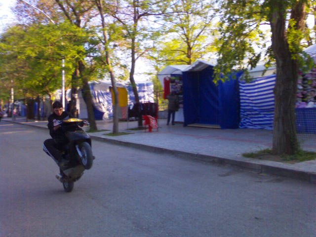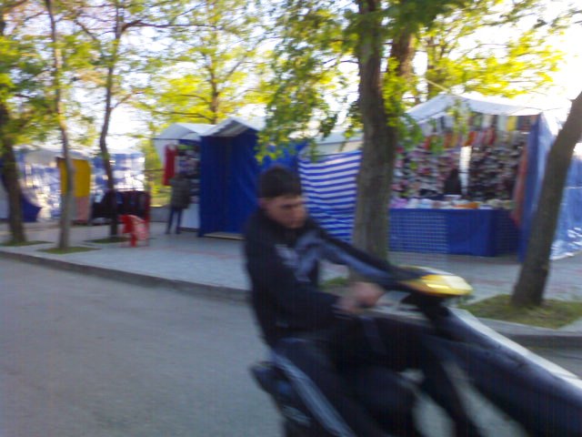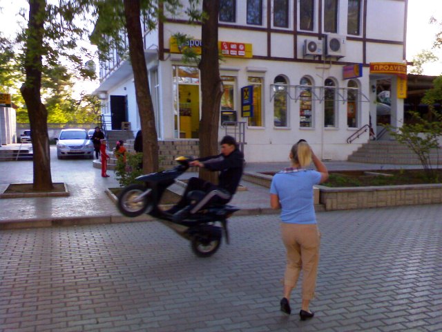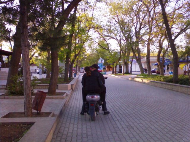 ЕвпаторияПризнаюсь честно,  фоторепортажа о Евпаторийских каскадерах в парке имени  Фрунзе не было в моих планах. Я просто с супругой вечером 16 мая вышел на прогулку к морю, хотел побродить в тишине  по аллеям парка. Но прогулка у моря оказалось делом весьма рискованным. По аллеям парка за нами буквально гонялись легковые автомобили местных бизнесменов. То и дело приходилось отскакивать к обочине, чтобы не оказаться под колесами автомашин. Тут же,  в парке  на самом берегу моря «крутые» автолюбители организовали автостоянку. Но самую большую опасность представляют для отдыхающих юные мотоциклисты. Дошло до того, что на улице Фрунзе, где запрещено движение автотранспорта, они устроили настоящие автогонки. И что интересно, ни в парке Фрунзе, ни на прилегающих к нему улицах и набережной имени Горького я не обнаружил ни одного сотрудника милиции, который мог бы остановить этот автомобильный беспредел. Не оказалось здесь и поста ГАИ, а ведь по улицам, предназначенным для пешеходов, гуляют дети. Неужели, для того, чтобы навести элементарный порядок в курортной зоне нужно дождаться громкого ЧП. Специально для руководства ГАИ Крыма я публикую серию фотографий из курортной зоны Евпатории. Пора наводить порядок, господа гаишники.
