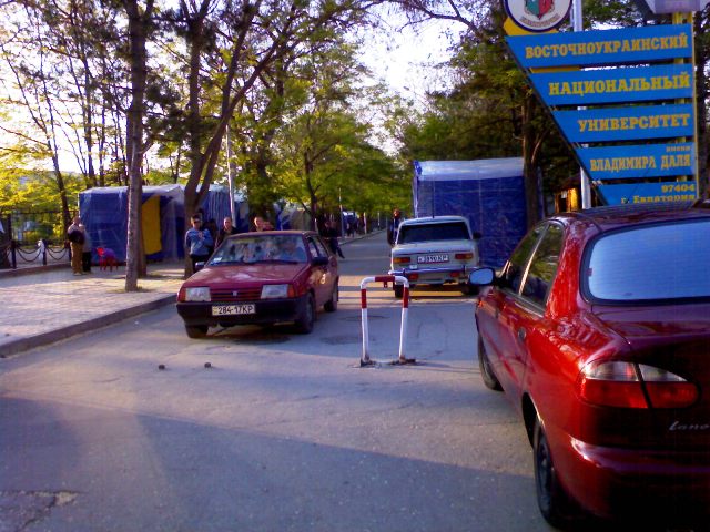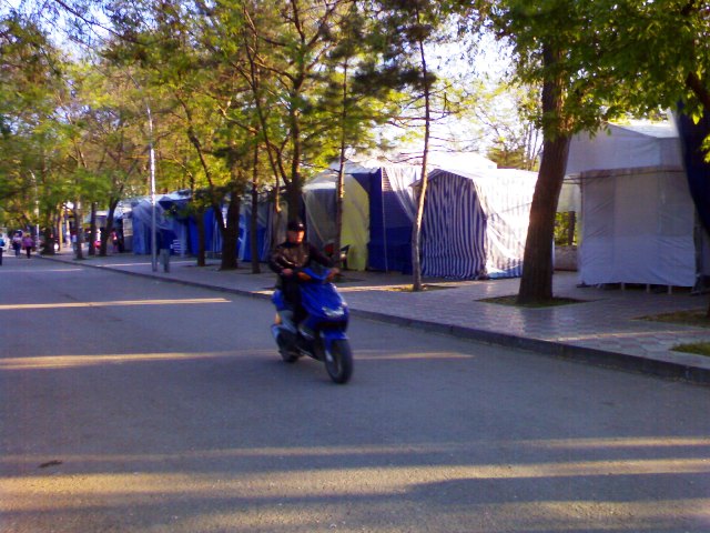 Эти фотоснимки на улице Фрунзе я сделал в течение трех минут.  Продавцы ларьков утверждают, что  пешеходная зона здесь уже давно превратилась в самую оживленную автотрассу, где носятся на огромной скорости десятки автогонщиков