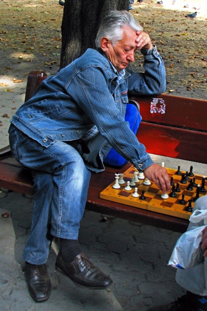 Имею в виду  шахматистов. Игроки задумчиво застыли на лавочках точь-в-точь  живые скульптуры. Лишь по недоразумению никто не фотографировался с ними на память. Но зато шахматистов   окружали болельщики.  Такие же невозмутимые. Они как бы дополняли  скульптурную композицию. Картину портил подвижный сухощавый старикашка. Он никак  не мог понять странного равнодушия слоняющейся публики  и после каждого удачного хода риторически обращался к толпе: