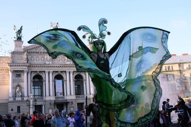 Юрий Теслев во ЛьвовеИзвестный крымский фотохудожник Юрий Теслев недавно побывал на традиционном международном  театральном  фестивале в Львове «Золотой лев». Он прибыл туда вместе с артистами   знаменитого «Шоу великанов» и театра живых скульптур Евпаторийского городского центра досуга под управлением заслуженного работника культуры Виктора Арихина.  В своем очерке Юрий Теслев  не стал описывать  происходящее на фестивале, не без основания полагая, что  лучше всяких слов расскажут о событии  его превосходные снимки.  Вместо этого Теслев поведал  о собственных приключениях и открытиях, сделанных  на фестивале. Что именно разглядел неугомонный следопыт, вы можете увидеть прямо сейчас. За окном бежали  унылые  пейзажи степного Крыма. Неожиданно к полотну выскочил столб с угрожающим  щитом: «Ходить  по путям небеспечно!».  - Какое неуклюжее слово «небеспечно»,- невольно подумал я. -  Зачем было нанизывать два отрицания подряд: «не» и «без»?  Почему не сказать просто: «Хождение по путям опасно»? От философствования отвлекла перебранка. Пожилой проводник  на весь вагон наставлял артистов евпаторийского Театра на ходулях: - Коли собрались ехать на фестиваль  в Львив, то  и размовляйте украинскою мовою! - Совершенно правы, - пришел  на помощь молодежи. - Язык надо учить. Я, лично, как раз этим и озабочен. Ломаю голову над тем, как будет по-украински «опасно»?